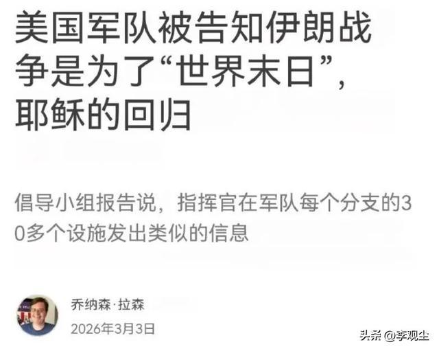 美军指挥官公然在备战简报里,用圣经末世论给士兵洗脑,把对伊朗的战争说成上帝的神圣计划,甚至宣称特朗普是耶稣选中的人,要在伊朗点燃末日信号火。