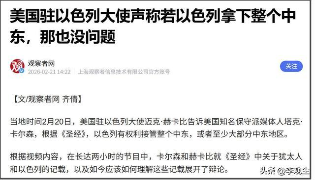 美国驻以色列大使赫比卡就曾公然宣称,以色列有权接管中东大部分地区,这种极端言论正是宗教思想失控的体现。