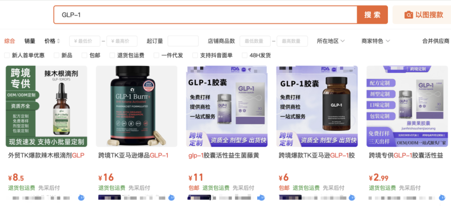 在某B2B平台搜索“GLP-1”,已有商家提供制药一站式服务。